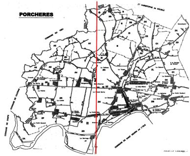 A Porchères, cette ligne imaginaire arrive du bourg de Saint-Seurin-sur-l’Isle, passe par le milieu de la rivière au niveau du moulin du barrage. Puis, il passe à environ 50 mètres à l’Est du carrefour de Brisson, traverse la plaine et passe à L’Est de Belle Source. Il traverse l’étang de la Treille, puis court dans la forêt. Il passe ensuite légèrement à l’Est de la Moterelle puis dans le partie Ouest du village de la Courtade, pour enfin quitter la commune et rentrer dans celle de Saint-Christophe-de-Double.