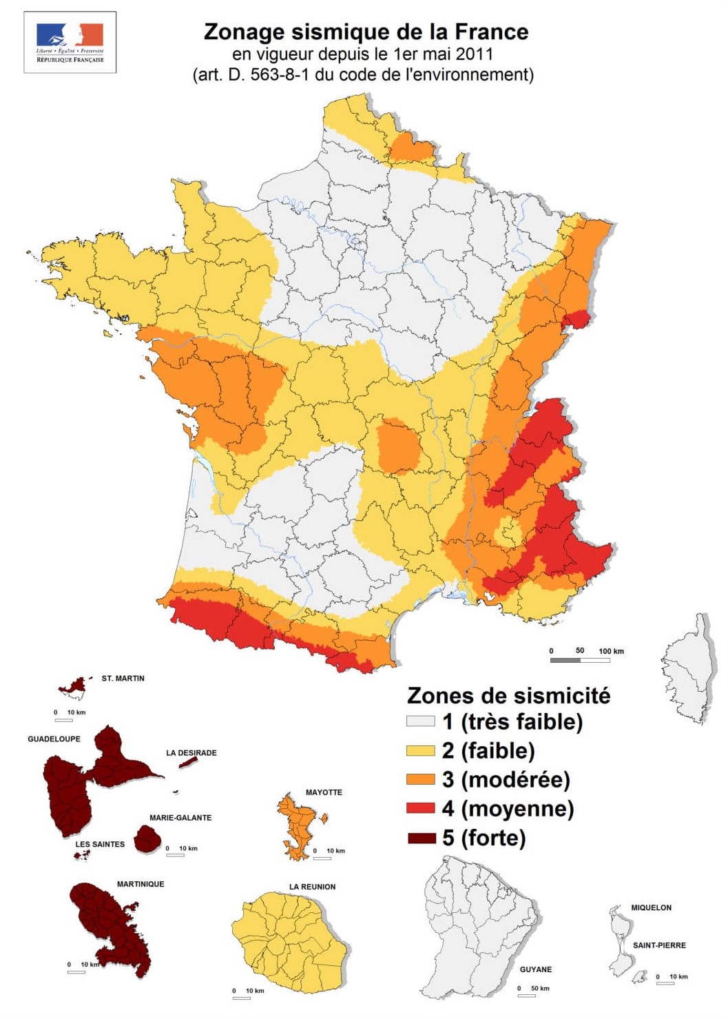 Depuis le 1er mai 2011, la France dispose d’un nouveau zonage sismique divisant le territoire national en cinq zones de sismicité en fonction de la probabilité d’occurrence des séismes :