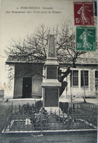 Durant sa réunion du 23 février 1919, le Conseil Municipal de Porchères décide à la majorité d’établir un dossier afin de dresser un monument commémoratif aux enfants de la commune morts pour la patrie. Il décide d’affecter le montant de la vente des acacias faite le 5 janvier précédent à Alfred Durandeau pour 160 francs et à Roger Bourreau pour 50 francs à la construction du Monument aux morts.