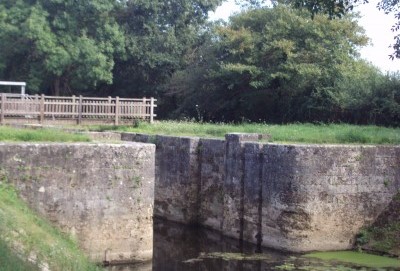 On voit, devant le moulin de Porchères, l’aboutissement du Canal de Chollet et l’ancien pont qui le franchissait. L’écluse de Chollet est au bout de celui-ci à environ 400 m.
